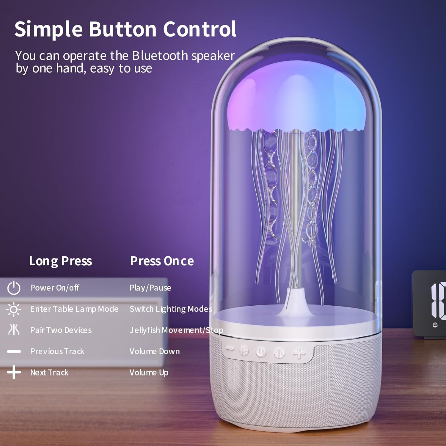 Type: Portable speaker/night light Model: MAX 113 Feature: LED backlight Design: Jellyfish form factor Power Supply: Built-in battery and USB port Battery Capacity: 1800mAh Material: ABS plastic Input Interfaces: 3.5mm, USB Type-C, memory card slot Wireless Interfaces: Bluetooth 5.2 Maximum Power: 10W Stereo Sound: Yes Sensitivity: 85 dB Max Frequency: 15000 Hz Operating Time: Up to 6 hours Charging Time: Up to 3 hours Transform your space: Immerse yourself in the serene beauty of an underwater oasis with our Jellyfish Mood lamp speakers. Eight multi-colored LED lights mimic the charming movements of jellyfish, creating a soothing and charming atmosphere.